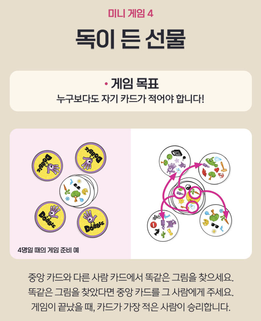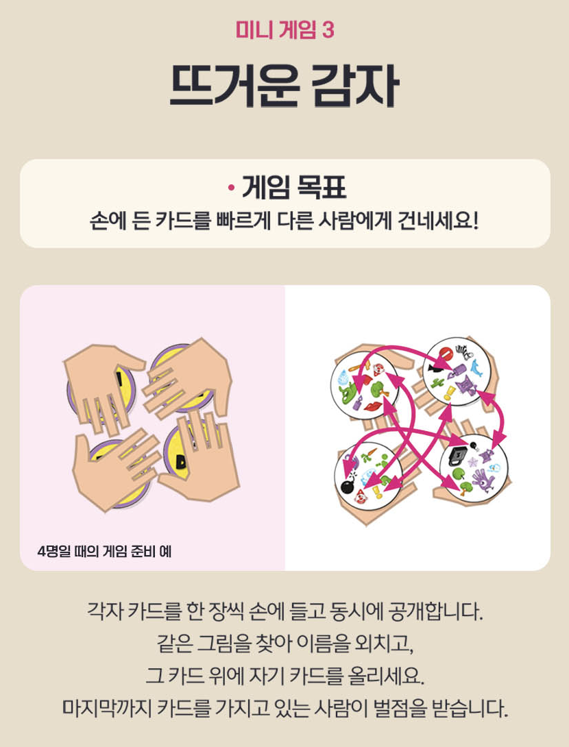 • 뜨거운 감자: 자신의 카드가 없어야 이기는 게임으로, 공통 그림을 외친 후 상대에게 카드를 넘깁니다.