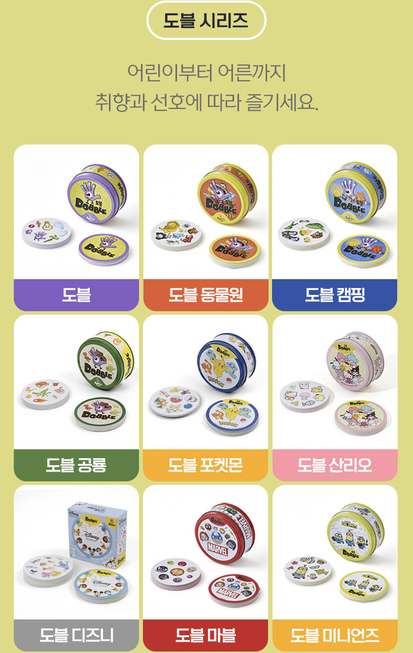 도블 보드게임은 4세 이상부터 추천되며, 시리즈에 따라 난이도가 다르게 구성되어 있습니다. 예를 들어, 도블 동물원은 초보자에게 적합하고, 세쌍둥이 규칙이나 다인전은 고학년 또는 성인에게 더 흥미롭습니다.